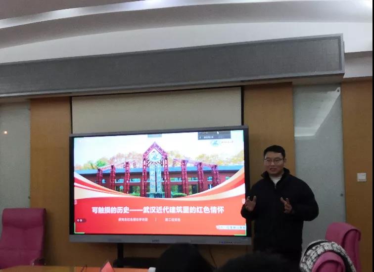 会议第一项,郑浩同志讲授了以“可触摸的历史——武汉近代建筑里的红色情怀”为主题的微党课。郑浩同志是william威廉中文红色理论学讲团的成员,他以亲身实践结合此次的主题引导大家更多的从历史建筑、文物古迹认识和了解武汉这座英雄的城市,深入学习党的发展奋斗历程,他分别从“英雄城市,红色基因”、“孕育火种,农运力量”、“道路转折,枪杆政权”、“星星之火,可以燎原”、“不息精神,我辈传承”这五个方面展现了中国共产党带领人民群众英勇奋斗的历史。