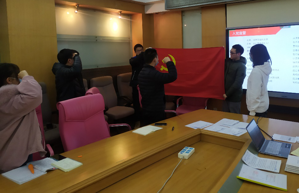 会议第三项,由支部副书记罗玙带领大家重温入党誓词。首先,全体成员起立,奏唱《国际歌》;之后,由罗玙同志领誓,全体成员面向党旗进行入党宣誓。