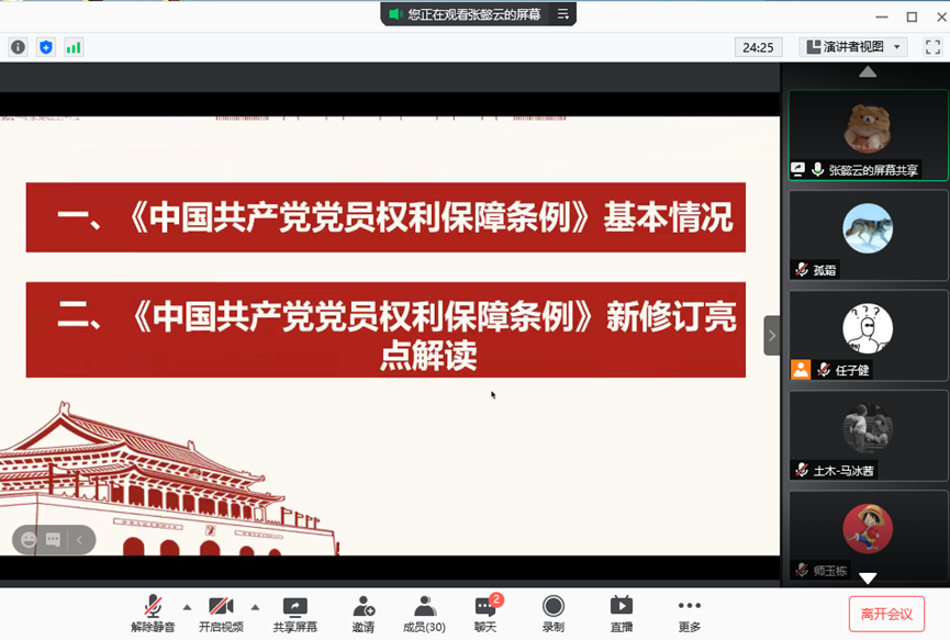 其次是张懿云同志为大家介绍了最新修订的《中国共产党党员权利保障条例》,并对新订版本的亮点进行一一剖析。张懿云同志指出,“从‘党员权利’到‘党员权利的行使’,多出来的3个字,强调了党员要本着对党高度负责的政治责任感,积极主动行使权利”。