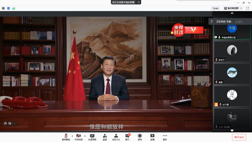 会议伊始,韦壹同志给大家播放了习近平总书记新年贺词的视频,并分享了自己的看法以及对未来的美好祝福。