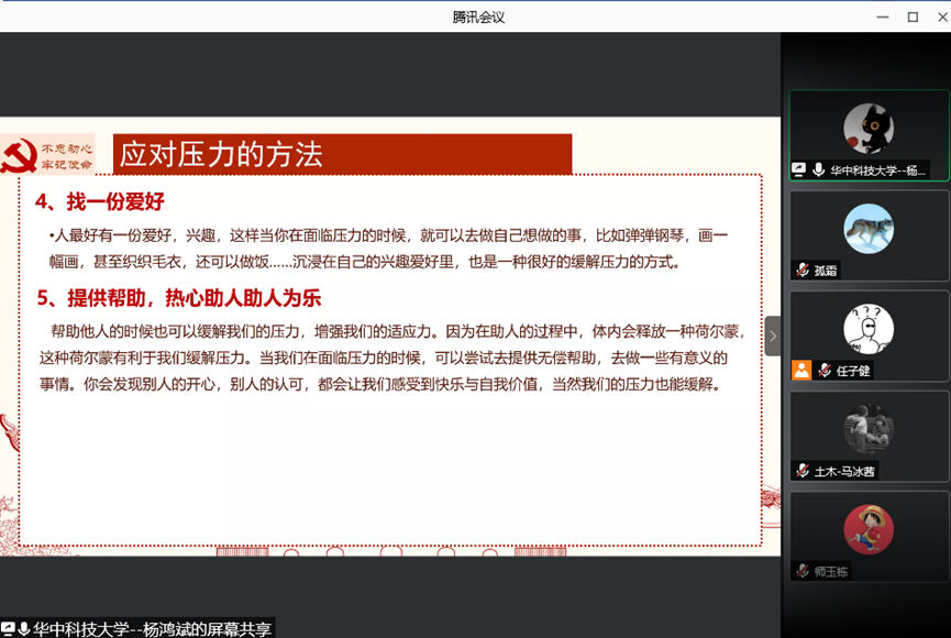 会议最后,杨鸿斌同志以压力这个接地气的话题展开讨论,包括升学压力就业压力等,同时还进一步拓展,提及中美两国乃至世界面对新冠疫情的压力,引起了支部成员的热烈讨论。最后,杨鸿斌同志为大家提供了一些缓解压力的做法,诸如找一份爱好、为他人提供帮助等。