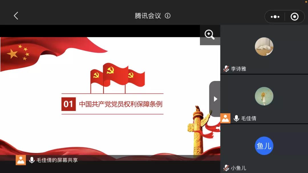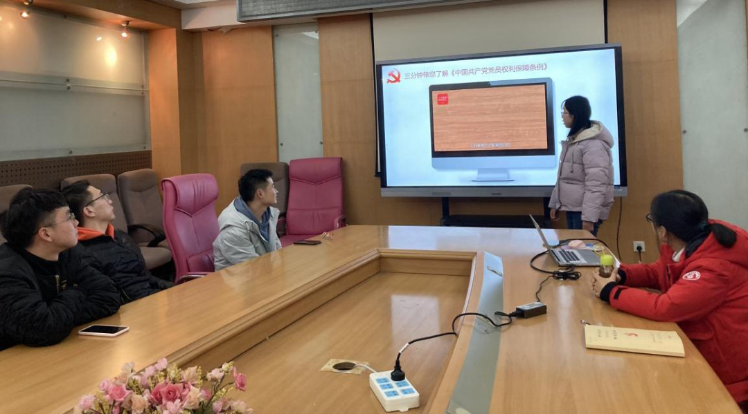 会议第一项,支部书记毛佳倩同志以讲授微党课的形式带领大家一起学习《中国共产党党员权利保障条例》。微党课对新修改条例的主要内容、党员可以行使的权力、党员应如何正确行使权力、党员不正当行使权力将如何处理等方面对《条例》进行了介绍。