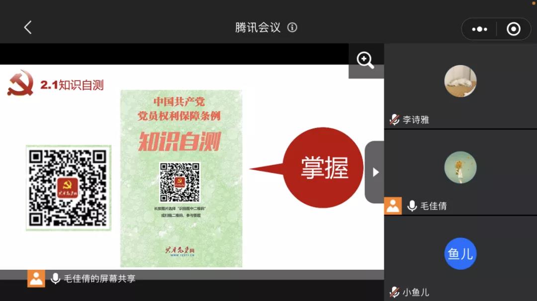 会议第二项,支部书记毛佳倩同志组织大家针对《条例》内容进行知识自测,对党员应知应会基本知识开展测试,加强支部党员理论知识学习能力。