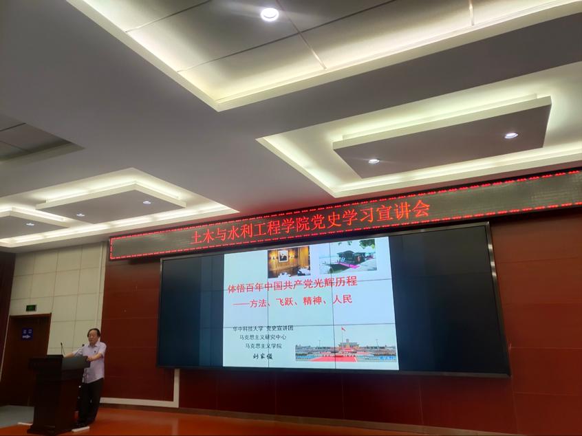 刘家俊老师以“体悟百年中国共产党光辉历程——方法、飞跃、精神、人民”为主题进行了本次党史学习宣讲。他指出,对于党史的学习不仅仅是书面的四史学习,更重要的是对其背后实际意义的学习,要培养建设性思维,从党史中悟出建设性,培养建设性思维建设新世界。