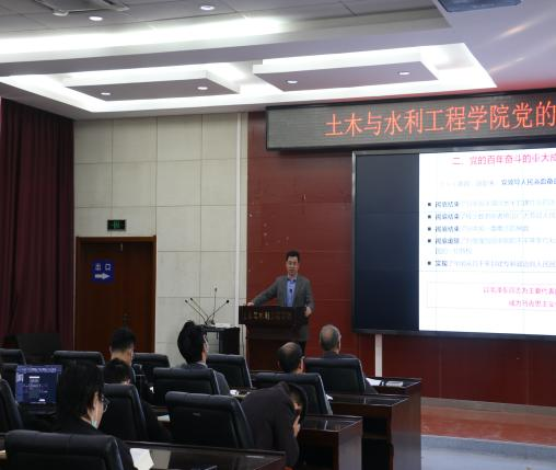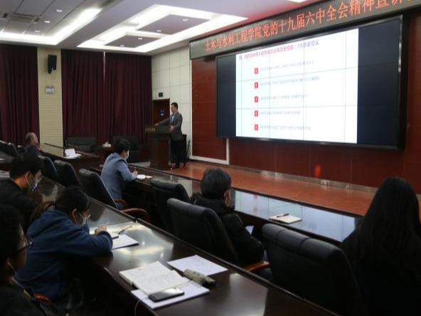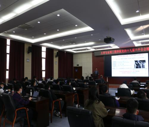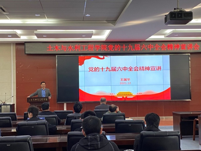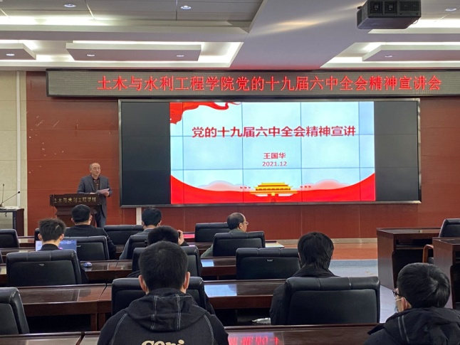 2021年12月23日下午,威廉williamhill党的十九届六中全会精神宣讲会在西六楼五楼报告厅举行。学校宣讲团专家、公管学院王国华教授以“党的十九届六中全会精神宣讲”为题作报告。宣讲会威廉williamhill党委书记李斌主持,学院领导班子成员、各党支部书记、教师代表、学生代表参加。