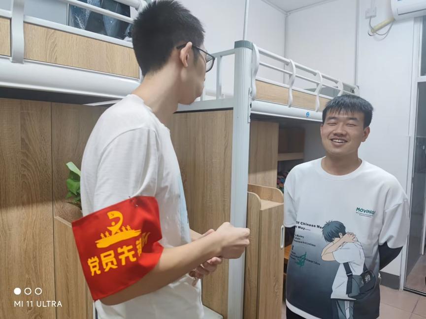 在短暂的集合准备后,学生党员们佩戴着袖章,有序进入各个寝室。