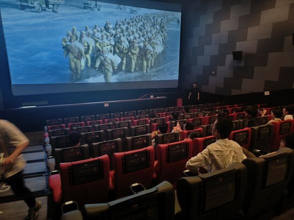 当日晚,支部成员前往影院观看电影《志愿军:雄兵出击》,回顾中国人民志愿军抗美援朝保家卫国的故事。1949年建国初期,新中国面临“内忧外患”的局面,朝鲜内战爆发以来,美军屡在中朝边境挑衅,平民惨遭轰炸。为了维护来之不易的和平,为了世代长久的安稳,1950年10月,中国人民志愿军入朝,“抗美援朝”战争拉开帷幕。电影展现一场激烈的“举国之战”,政治博弈场,毛泽东和斯大林谈判,运筹帷幄力争国家利益;朝鲜战场,即使军备实力对比悬殊,我军却用壮烈牺牲换回节节胜利;外交舞台,中华人民共和国代表团首度亮相联合国,中国新声赢得国际敬畏。曾经,先辈用鲜血与生命换来今日的和平盛世,当下,仍有无数人在用尽全力保卫来之不易的和平,影片告诉我们要永远铭记抗美援朝血色历史,肩负起民族复兴和国家富强的伟大使命。