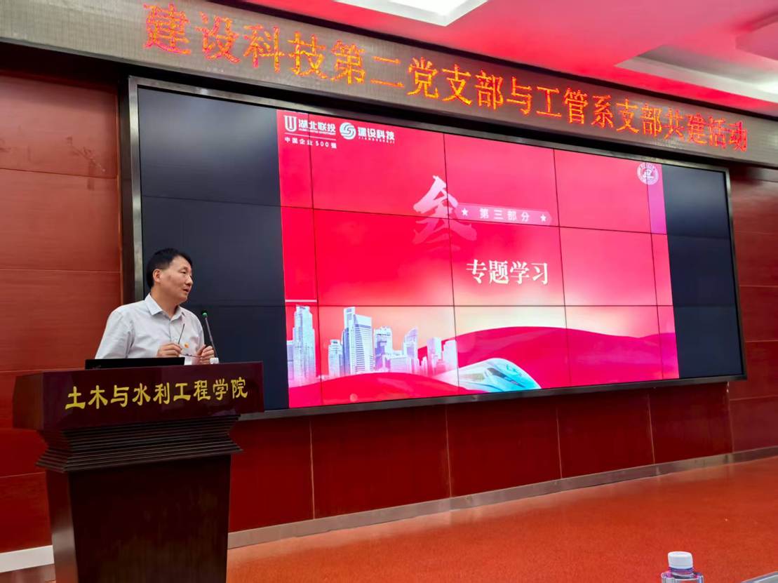 在正式交流环节,数字建造与工程管理系党支部书记孙峻同志与建设科技第二党支部书记石文娟同志分别介绍了各自支部的党建工作情况,分享了党建与业务融合的实践经验。随后,由石文娟同志领誓,全体与会党员庄严重温入党誓词,进一步坚定了理想信念和初心使命。