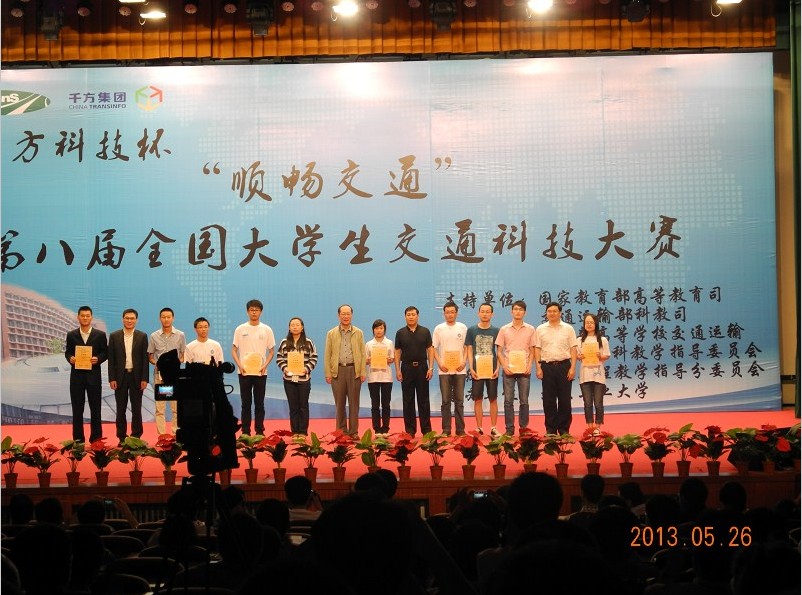 5月25日,千方科技杯;第八届全国大学生交通科技大赛决赛在北京工业大学举行,土木学院交通运输工程系刘有军副教授带队参加了比赛,由交通运输工程系2010级学生王帅、王巍、左康、李波、明小松等同学完成的作品《基于潮汐交通的多功能车道研究》,王凯、袁佳、曾丽榕、靳祥、杜乔等同学完成的作品《基于公交车辆到达顺序检测的公交停靠站设计》获得了三等奖。