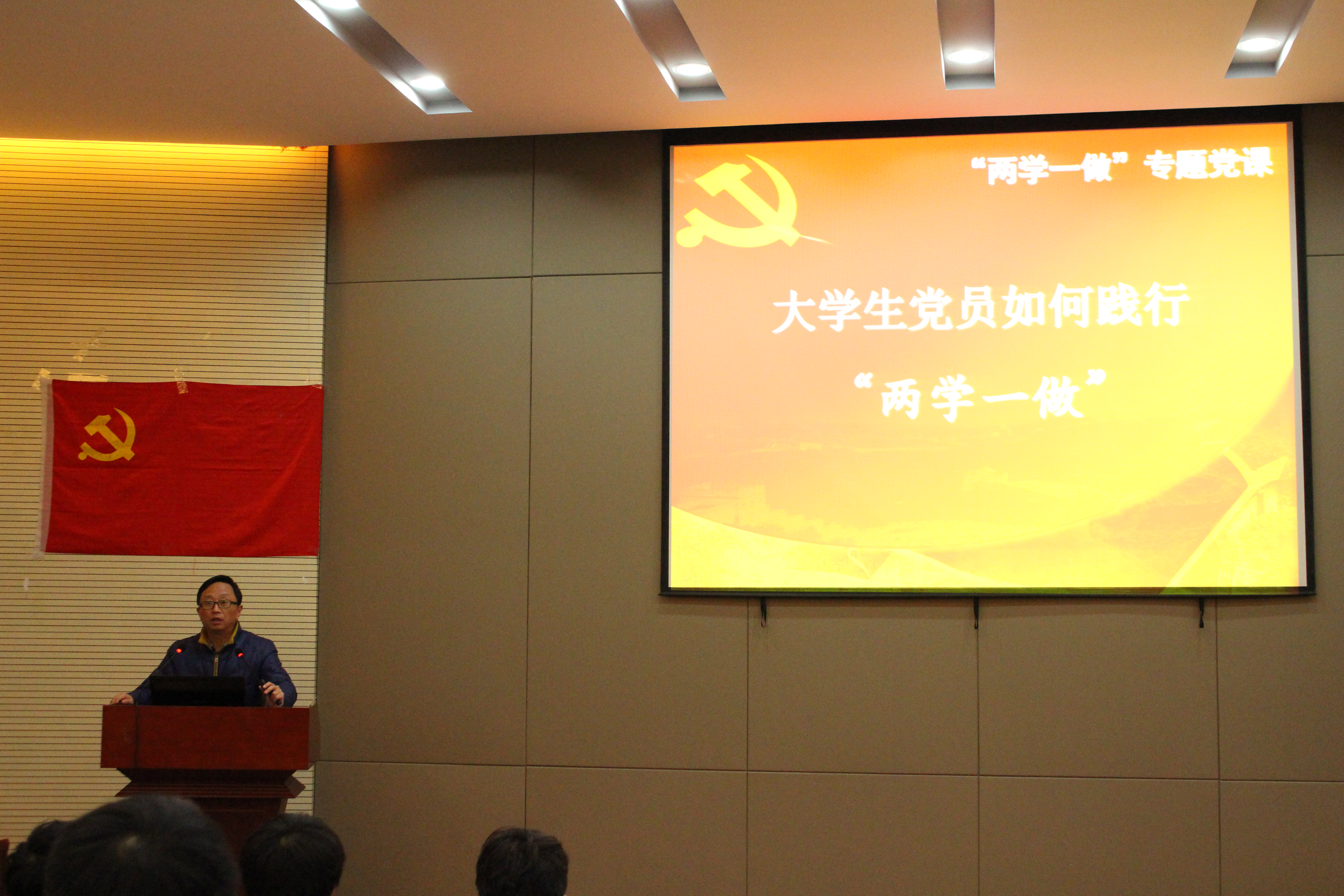 大会开始,毛勇杰为党员们上“ 两学一做”专题党课。党课中,毛勇杰再次强调了开展“ 两学一做”的原因以及“ 两学一做”的目标。随后,他从中央文件和习总书记系列讲话中的关键词入手,结合实际向党员同志们深入分析和讲解,例如讲解如何做到四个“ 进一步”,以此来规范本科生党员的言行。最后,他引用全国高校思想政治工作会议中习近平总书记的讲话,提出了党组织对大学生党员的要求,告诉同学们要永葆正确的入党动机,知行合一,做合格党员。党课完毕后组织全体本科生党员进行了“ 两学一做”知识测试,希望以考试促进学习,以学习带动行动。