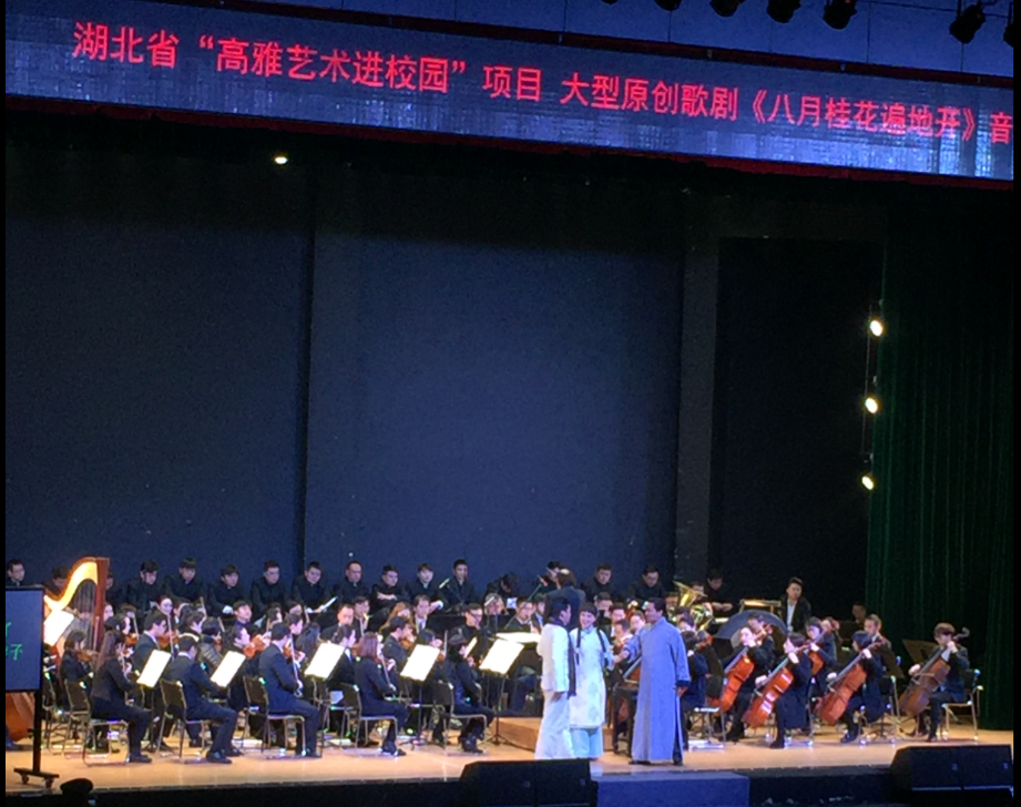 2016年12月22日晚,湖北省教育厅2016年“ 高雅艺术进校园”项目,音乐会版“ 八月桂花遍地开”在韵苑体育馆上演。本次音乐会由湖北省歌剧舞剧院进行演出,我校艺术教育中心承办,省歌剧舞剧院副院长,国家一级作曲家罗怡林对演出进行讲解。土木工程与力学学院与艺教中心沟通,争取到了120张演出门票,安排学院第24期入党积极分子培训班的全体学员观演。