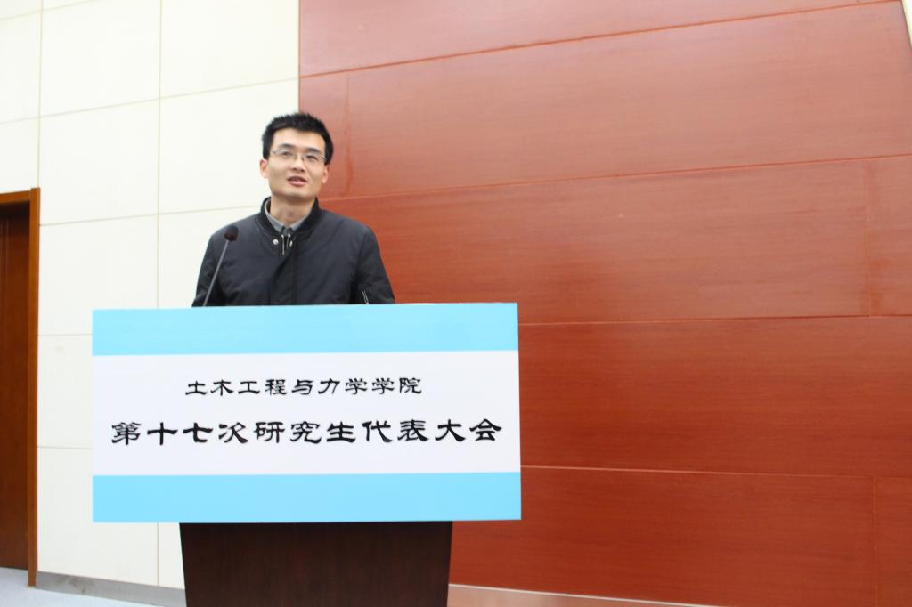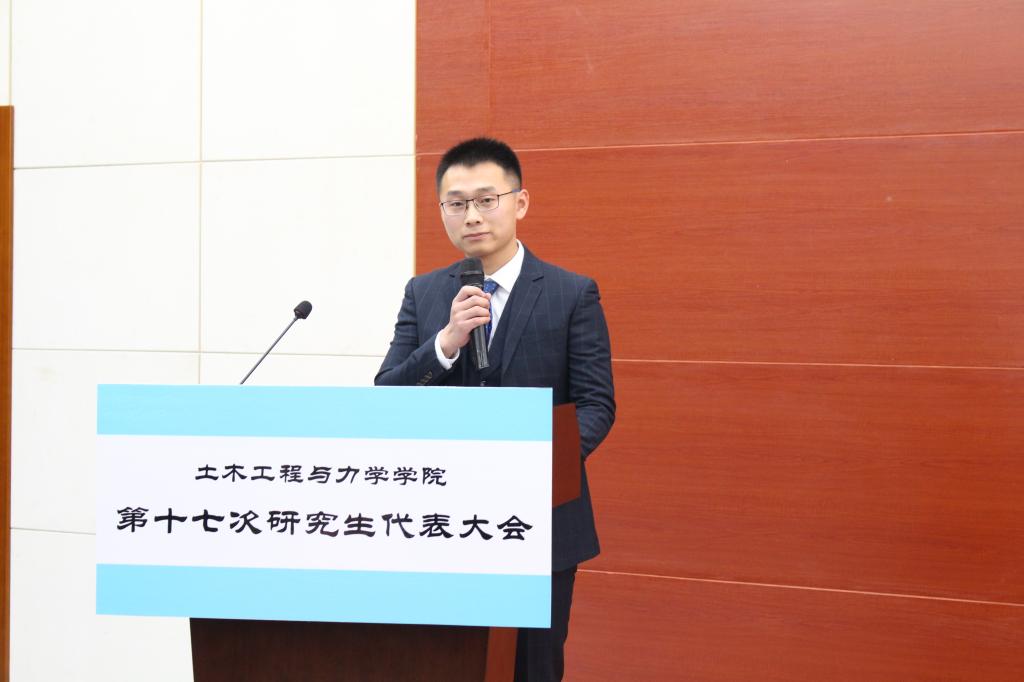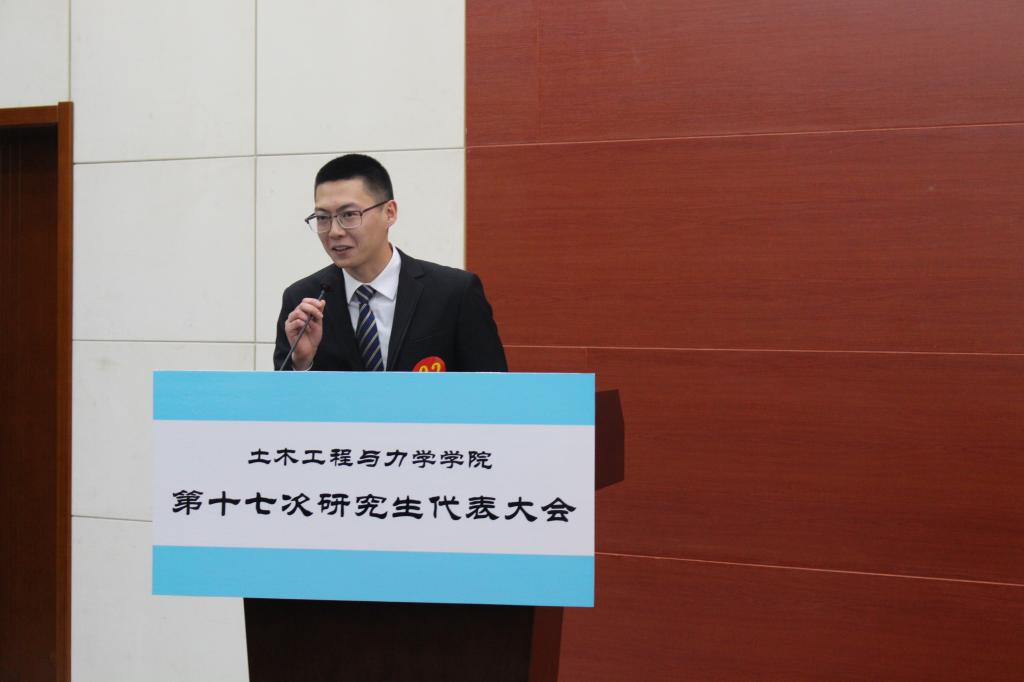 大会第三项,校研究生会副主席徐明宇宣读了校研究生会对土木学院第十七次研究生代表大会的贺信,表达了对土木学院第十六届研究生会工作的充分肯定,以及对即将选出的新一届主席团的殷切期望。