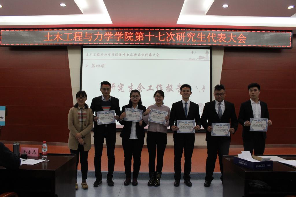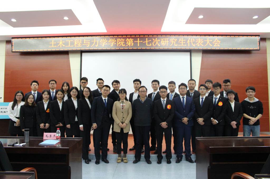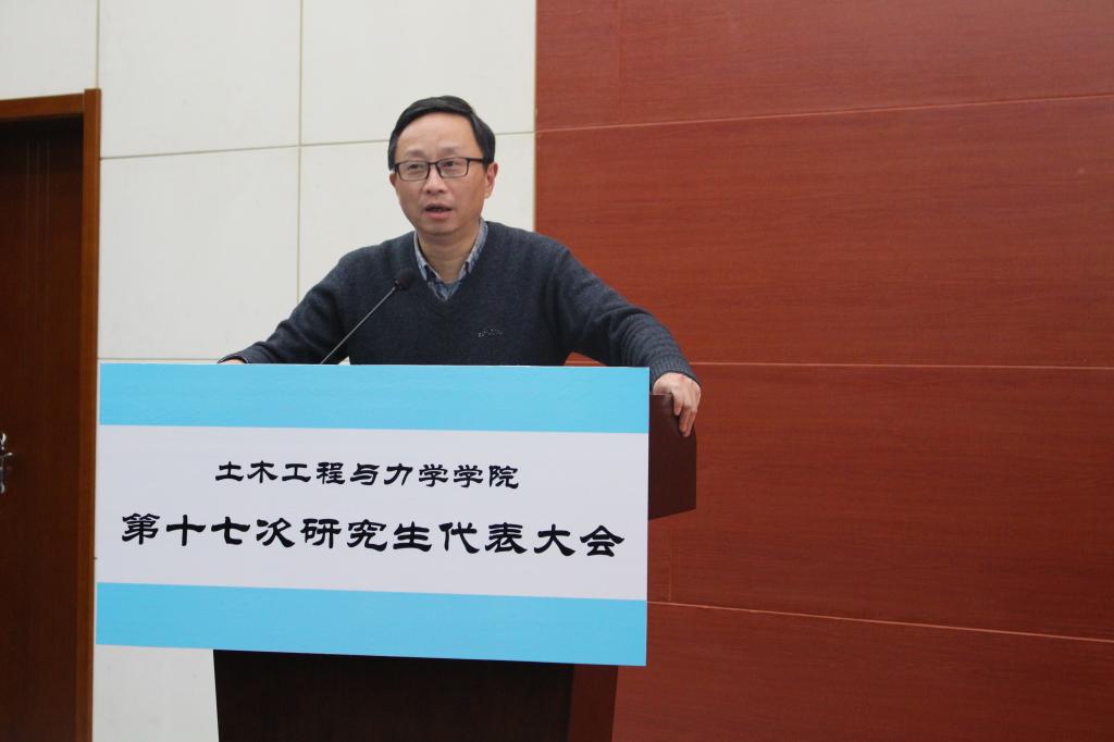 2017年12月15日,土木工程与力学学院第十七次研究生代表大会在西六楼五楼学术报告厅隆重举行。出席本次大会的嘉宾有:校党委研究生工作部思想政治办公室主任张发雄、土木工程与力学学院党委副书记毛勇杰、土木学院研工组组长马志凤、校研究生会副主席徐明宇。