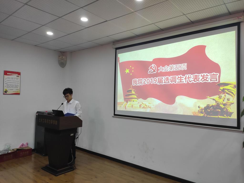 学院2019届选调生代表陈坤辉、赵雪飞、刘子安分别发表感言。他们用淳朴真挚的言语,为大家分享自己考选调生的一些心路历程,同时也表达了对学校、学院及老师们辛勤培育和帮助的感谢。他们表示,在今后的选调生岗位上,一定践行承诺,牢记使命,志存高远,脚踏实地。