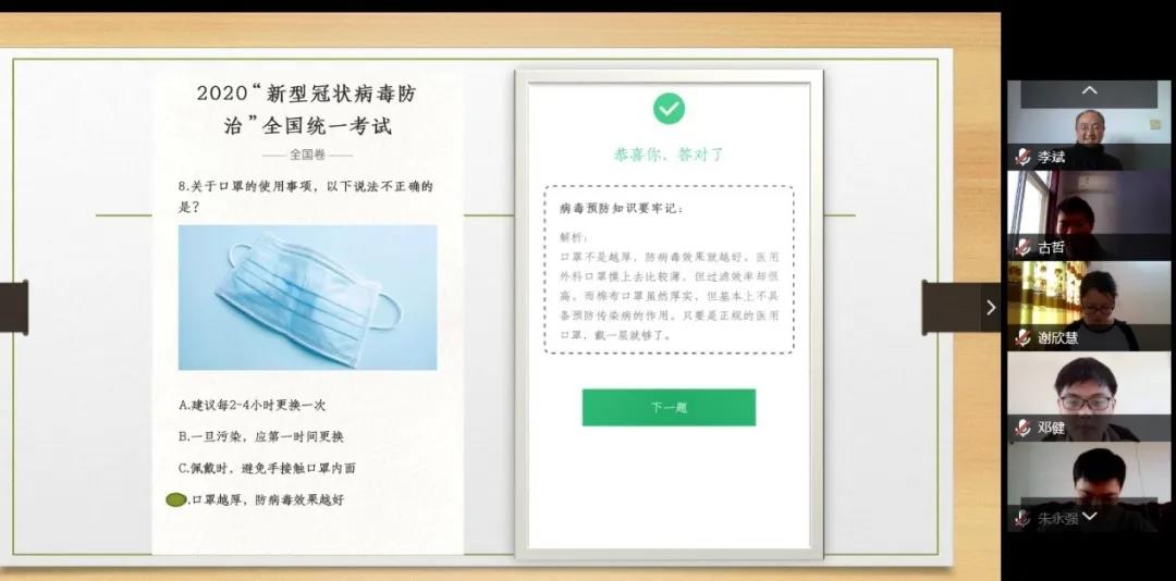 本次班团会通过知识竞答、故事分享、人物采访、感恩传递等方式,让同学们学习了疫情防控知识、分享了疫情期间的心得与感受,增强了同学们自觉担当时代责任、切实传承发扬“胡吉伟精神”的坚定理想。虽然疫情期间,老师和同学们无法当面交流,但通过线上视频,大家齐聚一堂,热烈交流思想,共同参与学习。