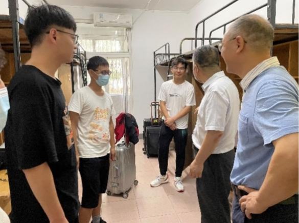 报到第一天,校党委常委、副校长梁茜,学校学生工作部就业指导与服务中心主任敬鹏飞,党委办公室、校长办公室督办室副主任翁维红,研究生院招生办公室副主任陈瑞学等相关部门负责人来到我院紫菘迎新点,与学院党委书记李斌、副书记何春一同到到学生宿舍看望新生,与志愿者和新生进行亲切交谈。梁校长对新同学的到来表示欢迎,详细了解新生报到和入住宿舍情况,勉励同学们珍惜在校时光,主动学习全面发展,坚持不懈地去实现自己的目标,将个人成长发展融入到学校学院的发展中去。