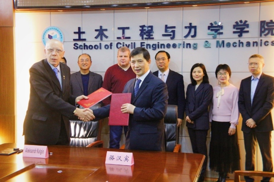 12月6日上午,俄罗斯国际工程院(International Academy of Engineering)副院长兼俄罗斯联邦建筑与建筑科学院(Federal State Russian Academy of Architecture and Construction Sciences)Aleksandr Kalgin 院士、俄罗斯国际工程院顾问Uirii Kalgin来访我校,代表俄罗斯国际工程院(IAE)与我校签署合作协议。土木工程与力学学院党委书记李斌、副院长骆汉宾、人事处副处长刘伟、国际交流处副处长陈洁、国际交流处马可娟等出席本次签署仪式。