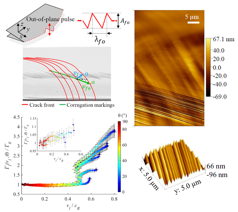 研究团队在进行高纯度单晶硅断裂实验时发现,裂纹在没有材料夹杂、缺陷及外界环境干扰(如声波)的情况下发生失稳,并产生周期性断口波纹。该失稳现象的独特之处在于它总是从裂纹前缘上对应某特定扩展速度的位置形成并扩展,表现形式为前缘振荡。该振荡的特征形状在扩展过程中保持不变,幅值经过短暂衰减后趋于恒定。通过对裂纹前缘的重构以及断裂能分布的解析,研究团队发现失稳物理机制是材料断裂能在裂纹扩展速度达到某临界值时突变,致使裂纹前缘在断裂能突变点发生纽结,进而演变为失稳振荡。