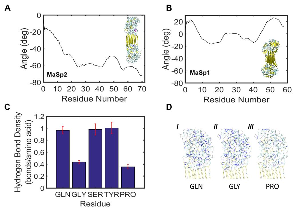 该团队研究表明,当相对湿度达到约70%时,蜘蛛大壶状腺丝开始产生超过每毫米300度的扭转变形。通过调节相对湿度,研究人员可精确控制蜘蛛丝的扭转变形,这一特性在蚕丝、头发丝和凯夫拉等纤维中未被发现。随后,他们基于蜘蛛丝的分子结构对该现象的物理机制进行了阐释。这种蛛丝主要由MaSp1和MaSp2蛋白组成,后者含有大量脯氨酸环,遇到水分子发生反应后脯氨酸环中的氢键以非对称方式被破坏,从而导致蜘蛛丝朝一个方向扭转。这一发现可以启发人们设计出新颖的扭转驱动器或人造肌肉,并有助于开发新型传感器、智能纺织品或绿色能源设备。