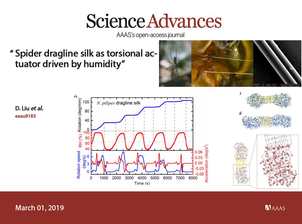 3月1日,土木学院力学系刘大彪课题组在美国科学促进会(AAAS)出版的《科学》(Science)子刊《科学•进展》(Science Advances)上发表了题为“蜘蛛丝用作湿度驱动的扭转致动器”(Spider dragline silk as torsional actuator driven by humidity)的研究论文。刘大彪博士为论文第一作者和共同通讯作者,何玉明教授指导了该项研究,硕士生郑诗敏、本科生余淼和余龙腾参与了该项研究。论文的合作者还包括:美国麻省理工学院Markus J. Buehler教授(共同通讯)、Anna Tarakanova博士、英国伦敦玛丽女王大学D. J. Dunstan教授和湖北大学刘杰教授。