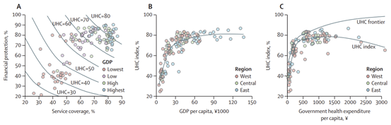 为此,团队进一步构建了涵盖中国全民健康指标及卫生资源分布的面板数据,首次揭示了中国的宏观经济和卫生资源特征与全民健康覆盖指标之间的影响机理。结果表明除了医护人员及床位资源以外,医疗基础设施的建设对于提升全民健康覆盖具有同样重要的作用。而与建设大型综合性医院相比,基层医疗机构与更多的全民健康覆盖指标显著正相关。因此,优化资源配置,提升初级卫生保健,将医疗卫生资源投放到基层医疗服务能力建设是帮助中国实现UHC目标的关键。