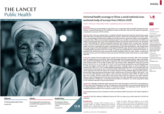 11月30日,我校丁烈云院士团队与王伟教授团队在国际著名期刊《柳叶刀-公共健康》(The Lancet Public Health,IF:72.427)上合作发表了基于近百万中国人口的多个横断面健康数据的研究论文"Universal health coverage in China: a serial national cross-sectional study of surveys from 2003 to 2018"'。该研究首次系统性评估了中国全民健康覆盖情况,揭示了宏观经济和卫生资源特征与全民健康覆盖服务能力间的新机制,进一步探讨了如何优化医疗资源配置提升我国综合卫生服务能力,对推进“健康中国”系列政策的制定具有重要指导意义。