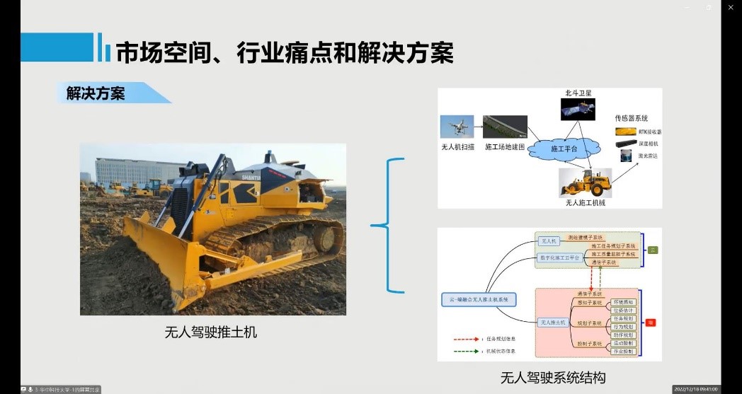 “无人推土机自动驾驶智能感知与控制系统”参赛团队由人工智能与自动化学院彭刚老师、威廉williamhill周诚老师全程指导,成员包括控制科学与工程专业21级硕士生段航琪和周奕成、20级硕士生彭嘉悉,土木工程建造与管理专业19级博士生尤轲,工程管理专业20级本科生刘彦辰。该作品由云端和车端两部分组成,云端集成了土石方工程三维场景感知重构模型和任务智能调度算法;车端集成了3D激光雷达和双目深度相机,可以获得施工环境信息,实现装备无障碍地行驶和工作。