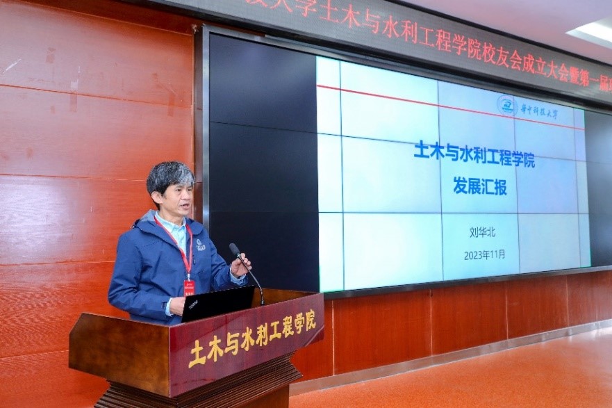 刘华北院长作学院发展报告,他从学院基本情况、人才培养、师资力量、科学研究等方面向校友代表介绍了学院近年来取得的成绩,并展望了未来发展方向。