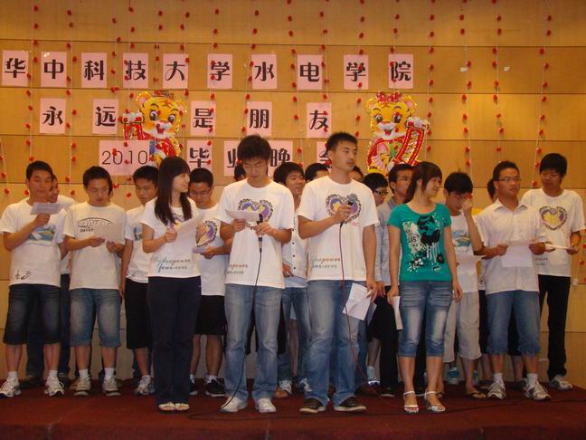 晚会以“我们永远是朋友”为主题,寓意水电学院的莘莘学子不管走到何方,大家永远都是好朋友。整场晚会节目内容丰富,表演者主要为大四的毕业生们,节目包括诗朗诵《奔向前方》,《写给离别》,歌曲《再见》,《爱我别走》等,几位大二的学弟学妹们也上台演唱了歌曲为毕业生们送行,充分展示了水电一家亲的温馨局面,水电学院分团委书记莫莉老师也上台为毕业生们演唱了一首《会呼吸的痛》,引起了现场同学们的欢呼。离别是悲伤的,但离别因祝福而美丽,最后水电学院0601班的合唱《祝福》激起了全场的大合唱,晚会气氛达到最高点。