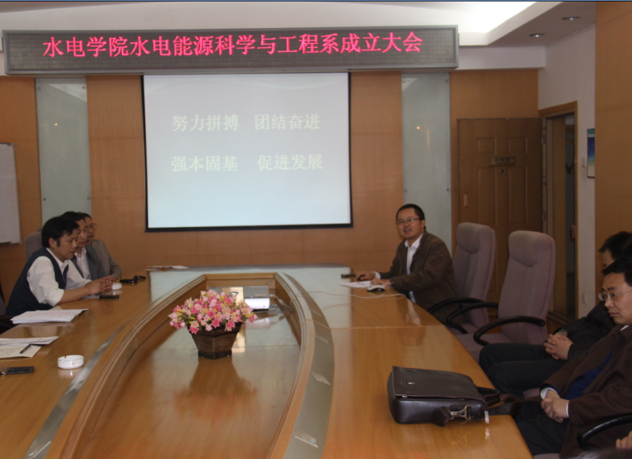 2012年4月6日下午,水电学院在仿真中心三楼举行水资源与水信息科学系和水电能源科学与工程系成立大会。出席大会的有学院党总支书记熊美欣,院长周建中,副院长常黎、徐学军,副书记刘洋,院长助理黎育红,办公室主任朱文杰等领导,水电学院水资源与水信息科学系、水电能源科学与工程系的全体老师。会议分别由水资源与水信息科学系主任曾致远和水电能源科学与工程系主任王金文主持。