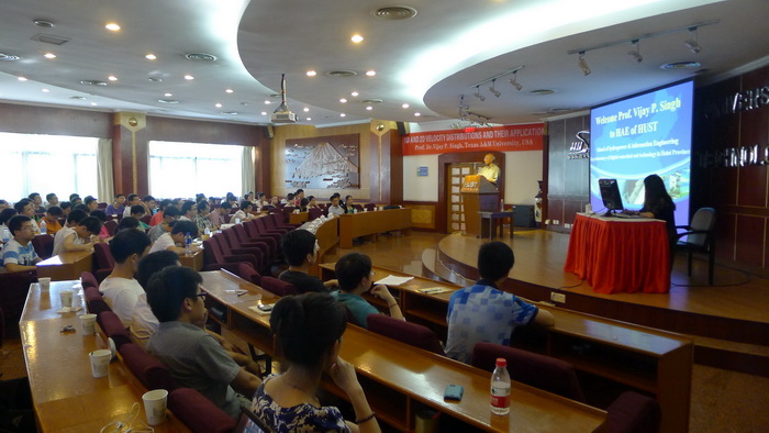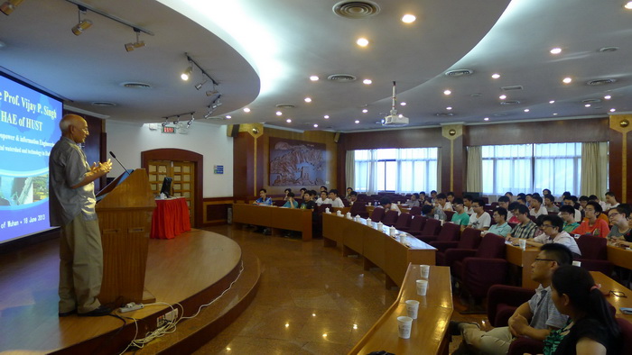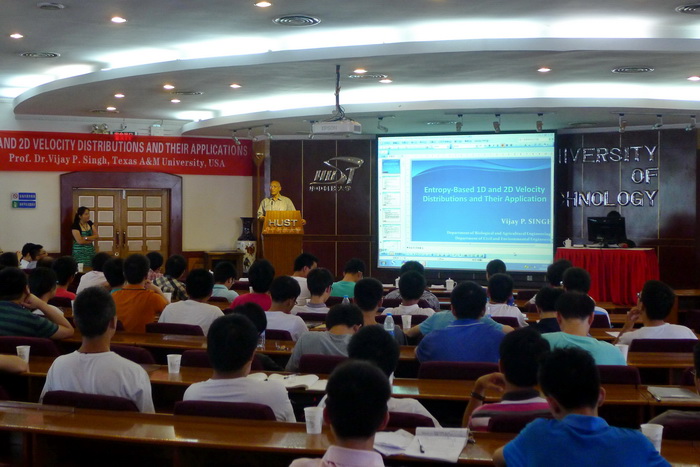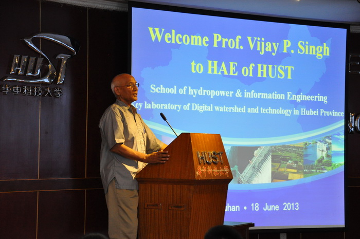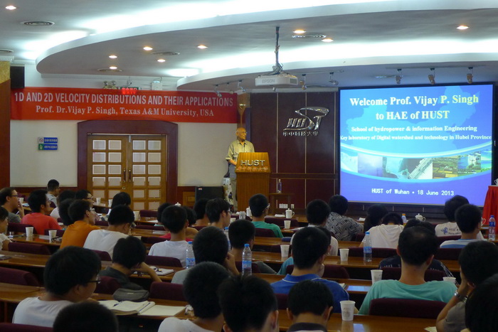 Singh教授此次做客水电学院是应周建中教授的邀请来校进行国际学术交流与讲学。Singh教授现为美国、德国、中国、印度等多个国家的客座教授,他的研究成果与学术成就显著,在国际学术界有着举足轻重的地位,他是《Journal of hydrological Engineering》期刊的主编,《Water Resources Management》、《Stochastic Environmental and Risk Analysis》等多个国际权威期刊的副主编。在国际学术期刊发表SCI文章600余篇,会议论文270余篇,编写论文集50本,出版专著17本,多次担任国际学术会议主席或做主题报告,他的研究领域包括:水文统计、风险分析、流域水文模型、全球变化对水文响应的影响、水文预报、水文站网布设、地下水等,基本涵盖了水文学科研究的各个方向。