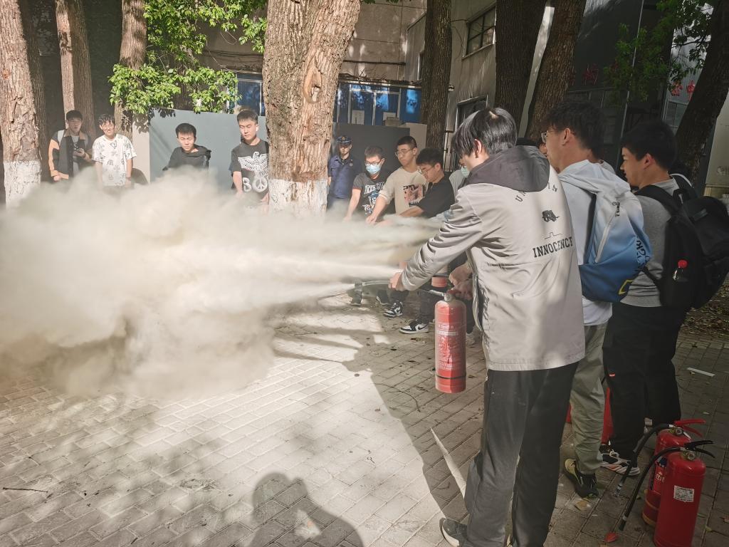 随后,大家井然有序地来到水电仿真楼下空地处。熊祥老师和消防工作人员亲自演示了灭火器的使用方法以及消防水带单手抛射及具体操作,在认真听讲及观摩后,同学们亲自体验了现场灭火的过程,面对熊熊燃烧的火堆,大家沉着地按照灭火的步骤和方法,将燃起的大火迅速扑灭。