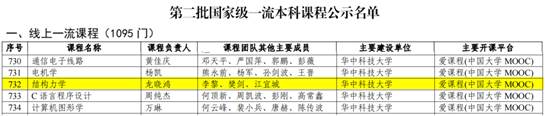 2023年4月11日,教育部高等教育司对第二批国家级一流本科课程认定结果进行了公示,共认定5751门课程,其中,线上课程1095门,虚拟仿真实验教学课程472门,线上线下混合式课程1801门,线下课程2076门,社会实践课程307门。我院龙晓鸿教授及课程组建设的《结构力学》课程获批国家级一流本科课程(线上)。