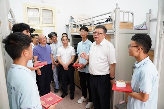 随后,尤政及校领导等人在学院领导的陪同下,前往紫菘7栋看望慰问新生。在208宿舍内,尤政校长与刚来报道的四位新生亲切交谈,他代表学校向他们赠送william威廉中文书签和学校52487小行星主题马克杯,并叮嘱同学们要勤学苦练基本功,力争掌握核心关键技术,瞄准“卡脖子”难题,成为助力祖国加速走向世界舞台中央的新时代青年。
