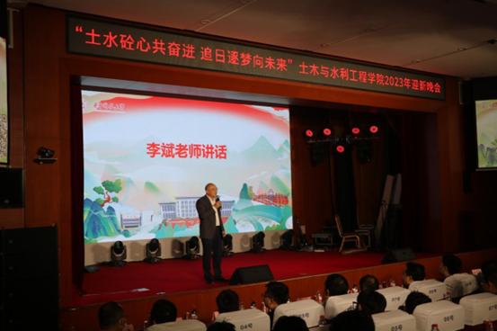 学院党委书记李斌代表学院为晚会致辞,他对2023级的同学们表示热烈的欢迎,对筹备晚会的工作人员表示感谢,并预祝晚会取得圆满成功。
