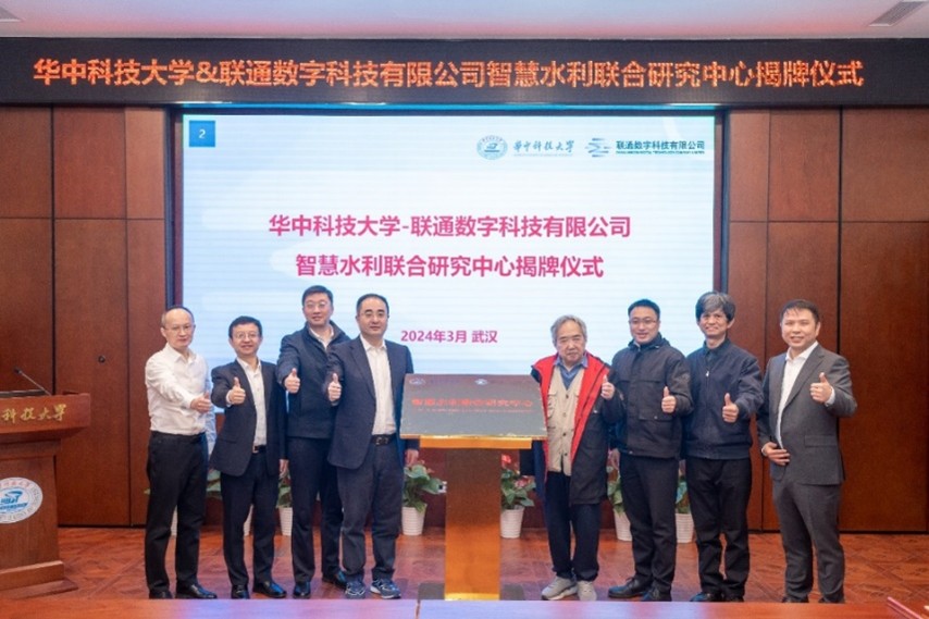 张勇传院士、于俊清副校长、联通数科魏春城高级副总裁、杨海明首席技术官、重大项目交付部唐菁总经理、中国联通生态环境服务部成湘龙总监、中心刘懿主任共同为智慧水利联合研究中心进行揭牌。