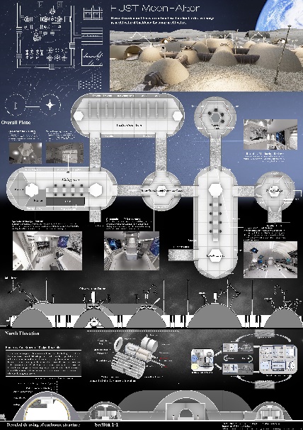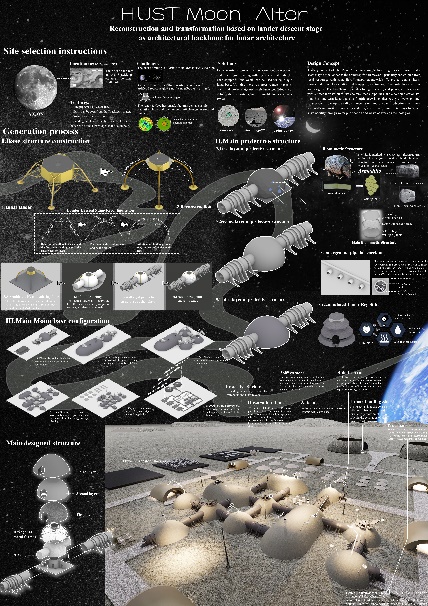 作品介绍:HUST-Moon Altar的核心理念是以月球着陆器下降级作为建筑结构的支撑骨架,包括三种防护结构:仿生防护结构、烧结月壤砖防护结构和堆积月壤防护结构。布局分为资源区、生活区、科研区和种植区,旨在实现月球原位资源利用,实现绿色、可持续的月面驻留。