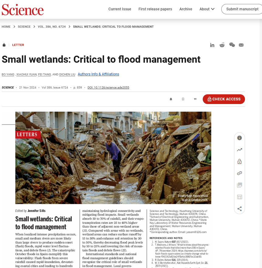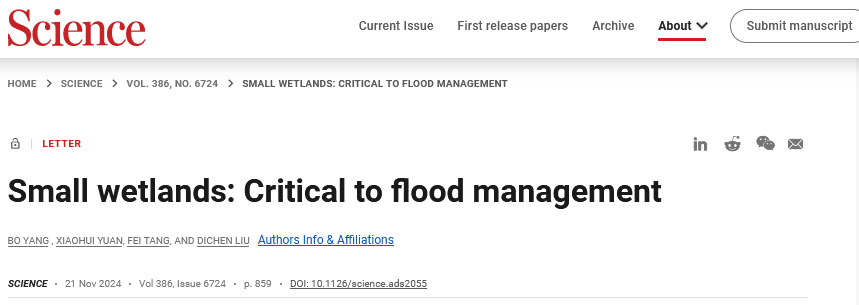 2024年11月21日,我院袁晓辉教授与长沙学院和武汉大学合作在国际顶级学术期刊《Science》上发表了题为“Small wetlands: Critical to flood management”的Letters文章,并被选为同期Letters封面。该文章针对河流防洪管理难题,提出系统地规划和构建覆盖全流域的、基于小型湿地群落的生态防洪体系,并与河流的堤防加固、导流工程、水库群调度等技术干预措施协同,有效提升极端情境下河流防御洪水的能力。该研究成果为全球气候变化条件下可持续的河流防洪管理提供了创新方案和可行方法,为双碳目标下我国流域水风光储一体化开发、充分发挥流域水电潜能奠定了基础。