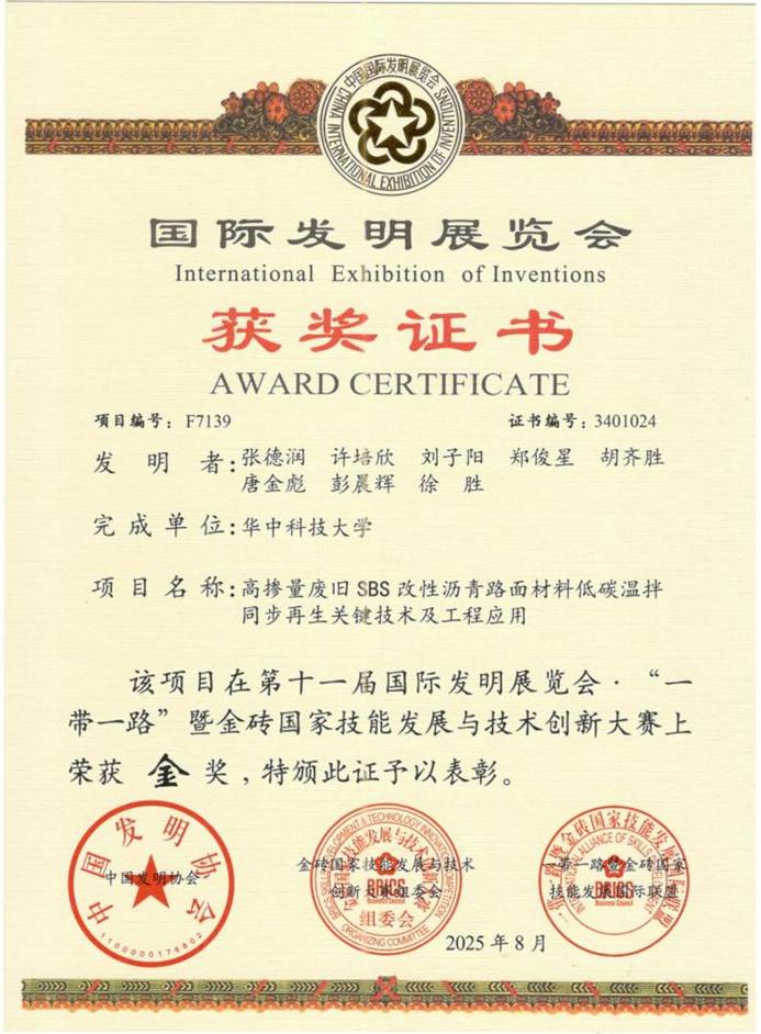 2025年8月22日至24日,第十一届国际发明展览会·“一带一路”暨金砖国家技能发展与技术创新大赛在广州举办,在来自全球30多个国家的2000余项发明创新成果中,我院张德润副教授团队项目“高掺量废旧SBS改性沥青路面材料低碳温拌同步再生关键技术及工程应用”脱颖而出,荣获国际发明展金奖。
