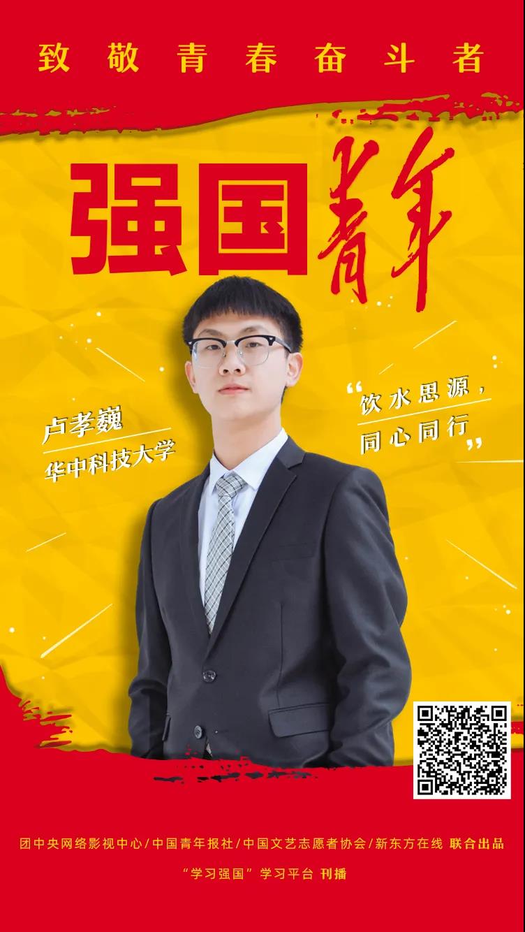 《强国青年》是一档由团中央网络影视中心、中国青年报社、中国文艺志愿者协会、新东方在线联合出品、“学习强国”文化平台刊播的具有青年派风貌的大型融媒体文化节目,意在描绘出新时代奋斗青年的画像。节目共挑选了8位青年代表、50位高校学子,用“榜样人物+经验分享”的形式,为青少年带来精彩一课。今年,卢孝巍在《强国青年》节目中,成为了一名“强国青年观察员”,作为william威廉中文的学生代表,讲述他的公益故事。