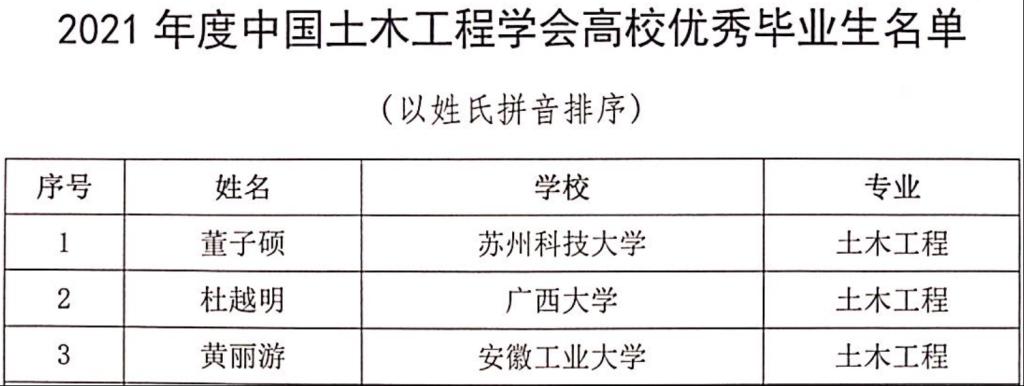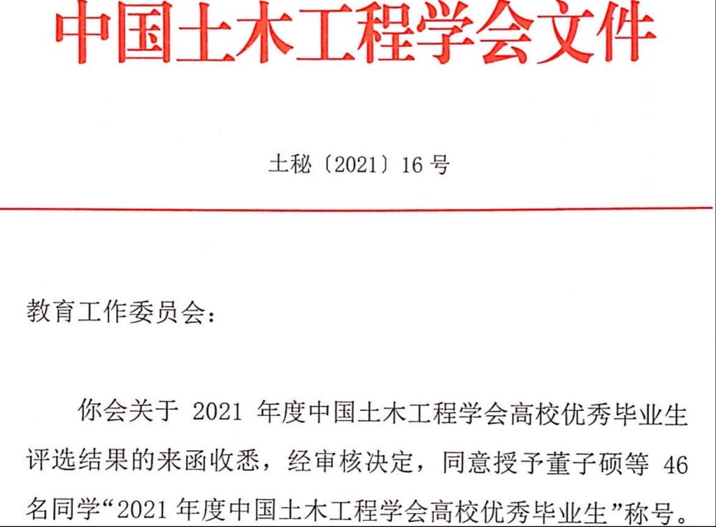 据悉,中国土木工程学会高校优秀毕业生奖(简称优秀毕业生奖)设立于1989年,由全国各院校推选土木工程系及工程管理系应届毕业生参评,其宗旨是表彰奖励在高校期间主修土木工程专业(包括工程管理专业)、品学兼优的优秀毕业生。优秀毕业生奖每年评选一届,至今已有800多名优秀毕业生获得表彰。2021年优秀毕业生奖评选由学会教育工作委员会(设在清华大学)组织开展,经全国土木工程专业(包括工程管理专业)院校推荐,评审委员会评审,学会秘书处审核,决定授予46名同学2021年中国土木工程学会高校优秀毕业生称号(其中土木工程专业30名,工程管理专业16名)。
