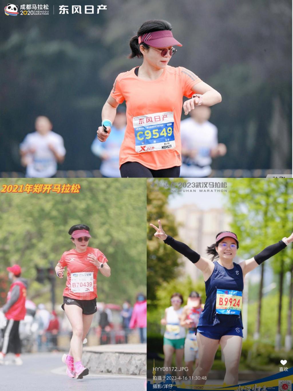 刘丽巧老师参加2020年成都、2021年郑开、2023年武汉马拉松全程42.195公里比赛