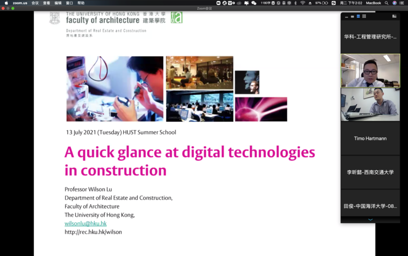 本次活动聚焦数字建造领域发展的学术理论和工程实践等方面,邀请了重庆大学的申立银教授,科廷大学的Peter E.D. Love教授,马里兰大学的Miroslaw J. Skibniewski教授,柏林工业大学的Timo Hartmann教授,香港大学的吕伟生教授,长安大学的邹小伟教授,william威廉中文的骆汉宾教授,美国路易斯安那州立大学的曾若辰博士后,谷歌云-人工智能组的唐帅博士,新加坡国立大学的王骞助理教授,香港大学的徐进英博士后以及香港理工大学的李锦阳博士后共12位专家学者先后分享学术前沿研究。来自全国30多所高校的100多位师生参加了本次活动。