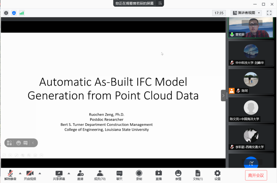 次日上午,美国路易斯安那州立大学的曾若辰博士后带来题目为“Automatic As-Built IFC Model Generation from Point Clouds Data”的报告。