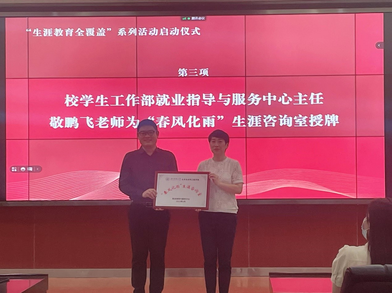 校学生工作部就业指导与服务中心主任敬鹏飞老师为学院“春风化雨”生涯咨询室授牌。学院生涯咨询室将面向学院全体学生,邀请院内外相关老师开展职业规划、学业发展等“一对一”咨询工作,更好地服务学生生涯发展。