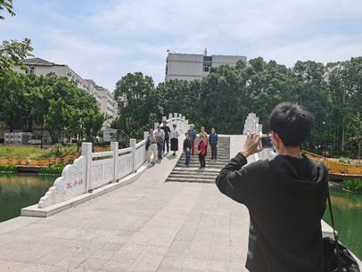 最后,大家来到了美丽的湖溪河畔漫步畅谈。从装饰一新的喻岱桥向北望去,新建的放舟桥从笔直的河道上跨越,清澈河道两旁的生态浮框上种植的水生美人蕉花开正艳,沿岸新建的黄色亲水栈道与绿色的河岸线相得益彰,户外运动课同学们划着单人赛艇在河中竞速,老师们在如诗如画的美景中向学生党员们介绍学校的发展变迁,大家相谈甚欢,合影留念。在一片欢声笑语中,本次“华科印象游”活动圆满结束。