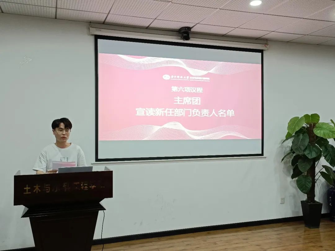 会议第四项,由主席团成员宣读新任部门负责人名单。通过个人自荐和主席团面试,最终五名同学脱颖而出,成为春季学期的负责人。新负责人通过简单的自我介绍,表达了对未来工作的期待和展望,希望各部门能在他们的带领下,继续砥砺前行!