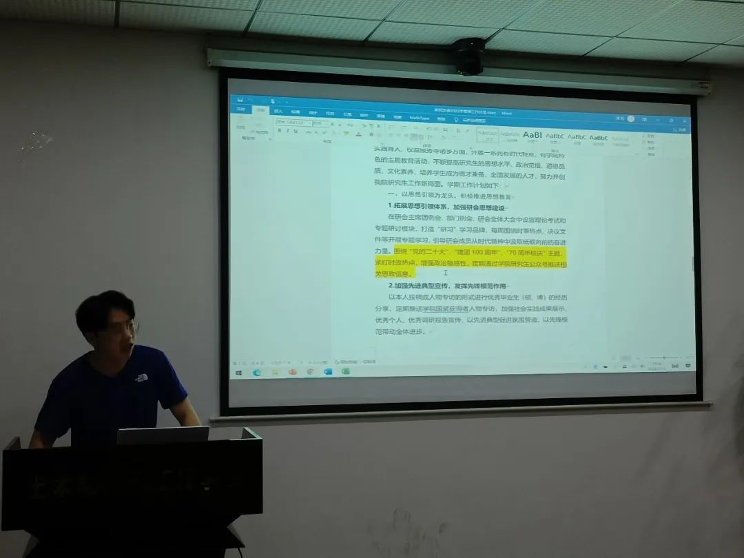 会议第五项,由主席团成员进行新学期工作展望。徐智韬同学从新学期工作方针和工作进程两方面对春季学期的工作展开介绍,强调本学期工作将重点围绕“党的二十大”、“建团100周年”、“华中大70周年校庆”三个主题开展。并表示新学期研会将不忘初心,继续奋进。