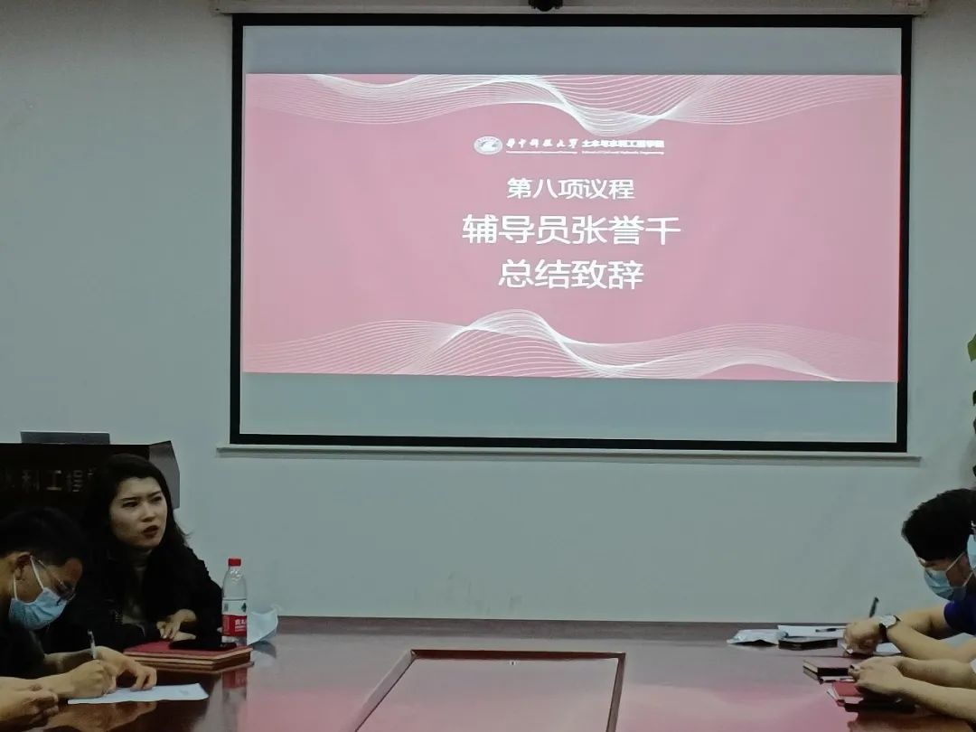 会议最后一项,由辅导员张誉千老师总结致辞。千导首先对研会上学期的工作表示了肯定,然后从五个方面对同学们提出了建议。第一,是鼓励同学们不要被工作中的不完美和遗憾打倒,只要我们用心、尽力去做那就是完美的;第二是落实的问题,或许我们在工作实施的过程中会遇到很多困难,但是只要坚持,相信总有一天我们的想法就能够落地;第三,是希望大家在工作中都更有主动性,对自己严要求才能让每一件事都更加的完美;第四,研会工作任务较为繁杂,希望研会成员能培养自己的规划能力,平衡好自己的研究生生活;第五,研会永远是一家人,希望研会能更加团结的拥抱在一起,分享生活、学习、工作的点滴。最后,千导对研会表达了衷心的祝愿,相信研会会越来越美好,每一个人也会越来越美好,研会每一位成员都会有质的飞跃和提升。
