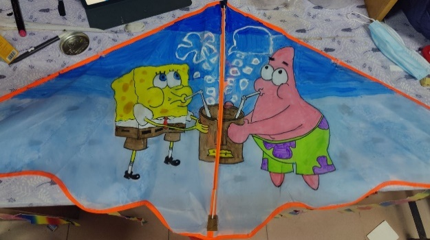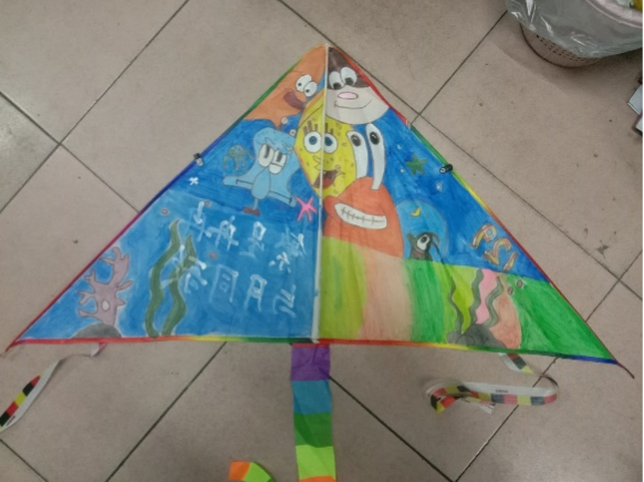 画的内容是海底世界的海绵宝宝大家庭,希望大家都能像海绵宝宝一样开心乐观、无忧无虑。左下角的彩虹,也会为大家带来好运呦!整体内容是动画风,但也不缺文艺气息,"繁星冉冉,与月同歌",让我们在一个明媚的下午,一起放飞风筝吧!